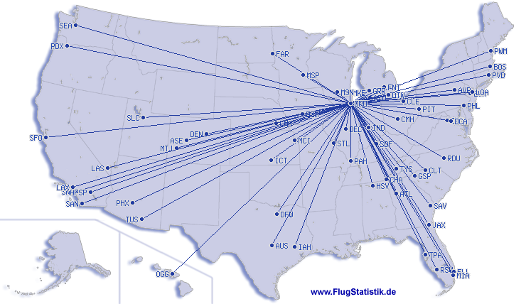 最短フライト: 108 km, 0:42 h, Milwaukee (General Mitchell) - Chicago (O'Hare), 03.03.2026
